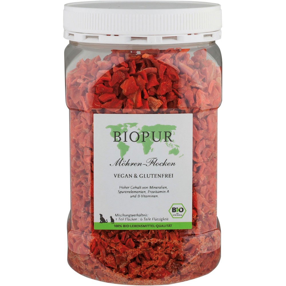 Bio Moehrenflocken 270g Klarsichtbox Hund Gemüse Biopur