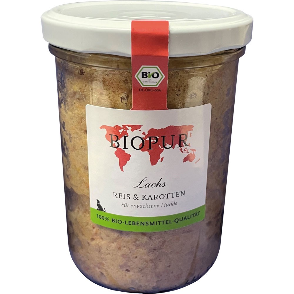 Bio Lachs Reis & Karotten 370g im GLAS (!!!) glutenfrei Hund Nassfutter Biopur