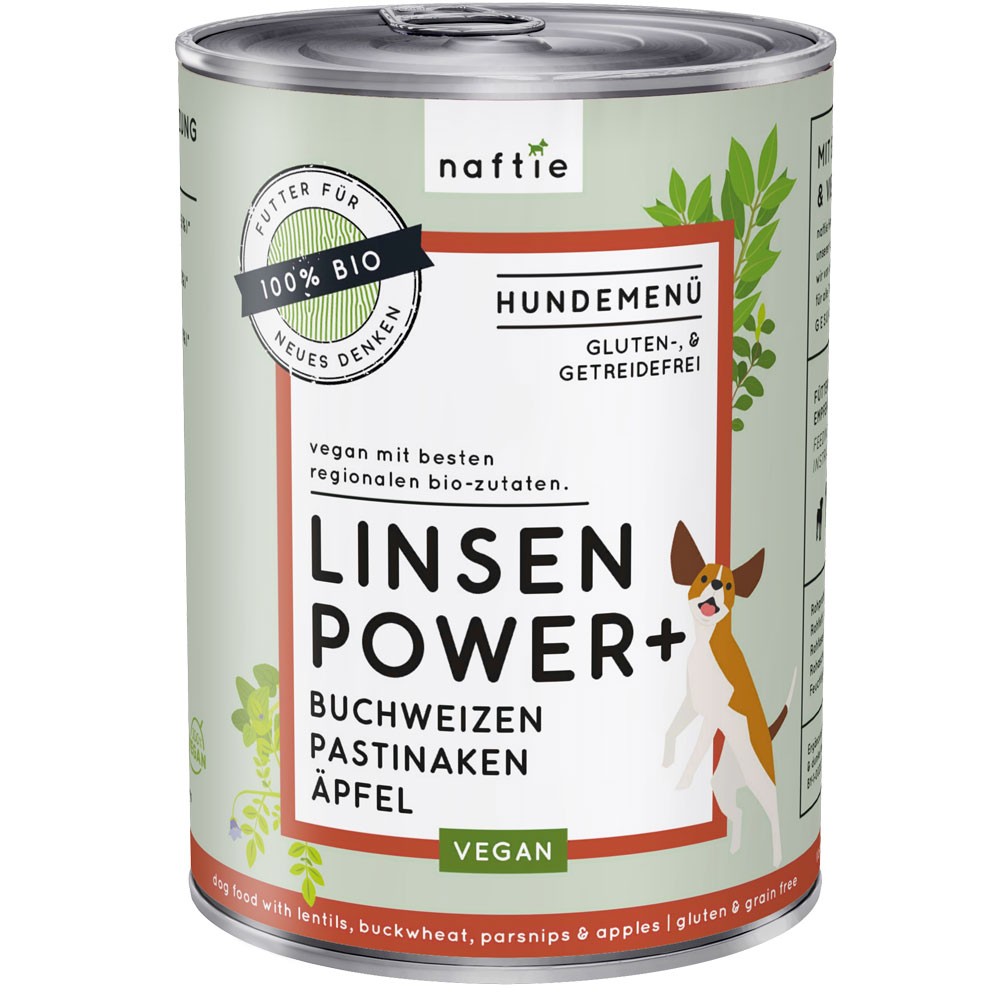 Das naftie Komplettmenü Bio Linsen Power+Buchweizen besteht aus 20 Prozent rote Linsen und jede Menge Pastinaken, Äpfel und Karotten. Für noch mehr Vitalstoff-Power enthält dieses purinarme Hundefutter Kürbiskerne, Kokosöl, Chiasamen und Spirulina, das wichtige Stoffwechselvorgänge aktivieren kann.