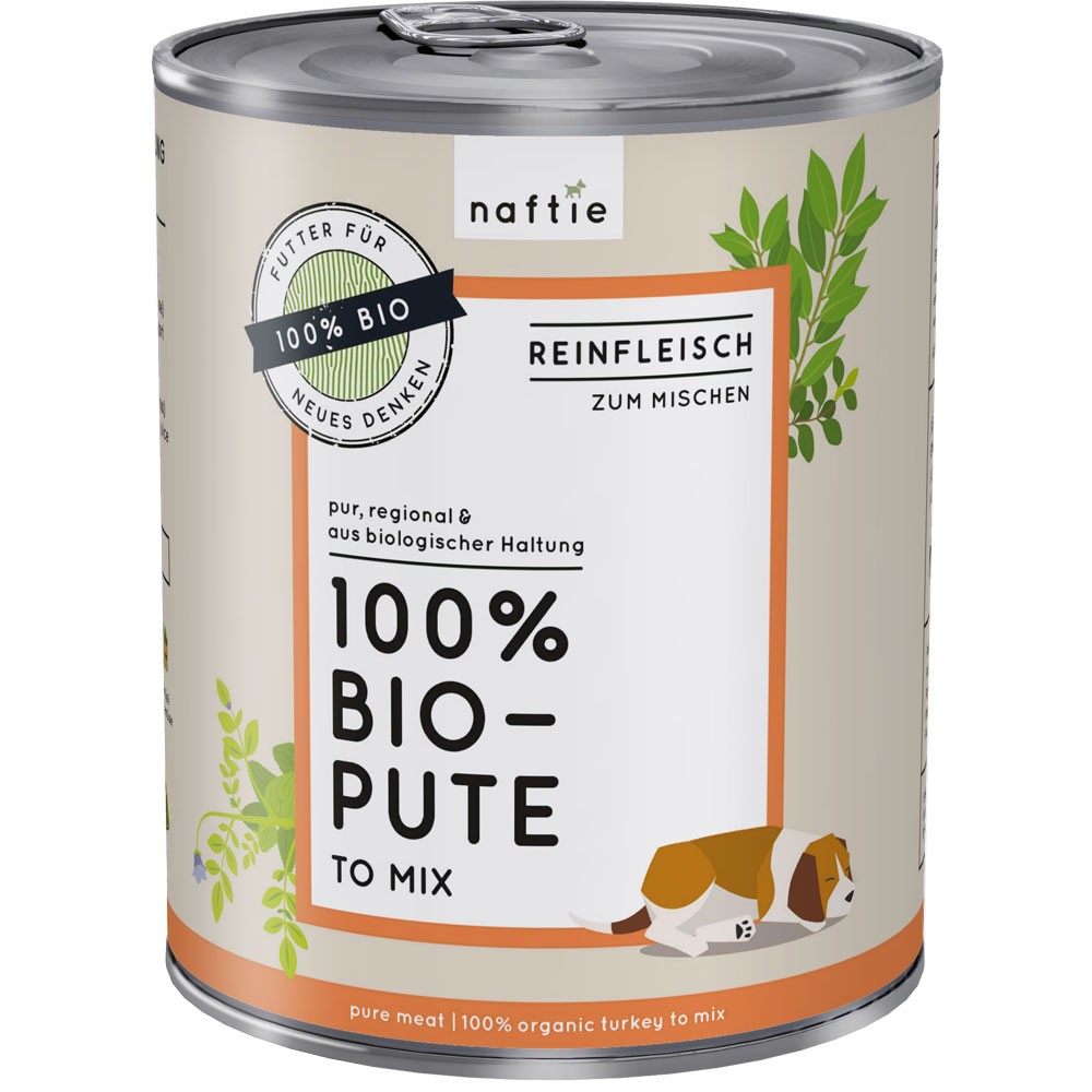 Bio-Reinfleisch mit 100% Fleischanteil von der Pute, Single-Protein. Die Putenfleischdosen aus viel Brustfleisch, Hals und Karkasse im eigenen Saft gegart eignen sich ideal als individueller Zusatz für selbst zubereitete Menüs, als Alternative zur Rohfleisch-Fütterung oder als Barffleisch-Ergänzung.