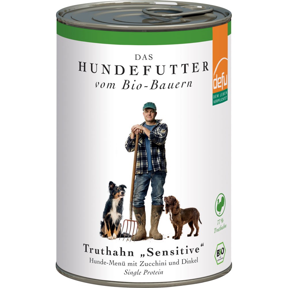 Das Hunde-Menü Truthahn Sensitive ist eine kräftige Komposition aus 77 % magerem Bio-Truthahn und gehaltvollem Dinkel. Dank leckerer Zucchini und schmackhaftem Kürbis ist das Menü reich an Ballaststoffen.